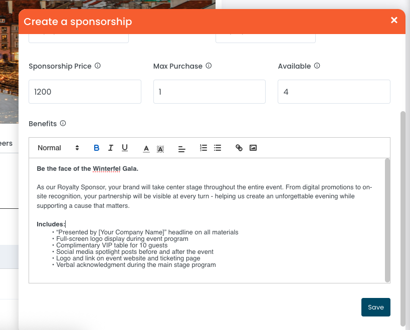 - Available: Specify how many total sponsorships are available at this tier. Once this limit is reached, the package will automatically be marked as sold out.