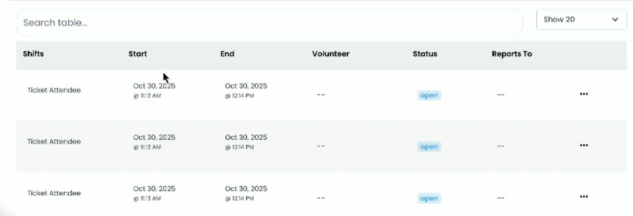 Here, you’ll find a list of all volunteers currently scheduled or assigned for your event, along with their shift status — such as Confirmed, Pending, or Unfilled.
