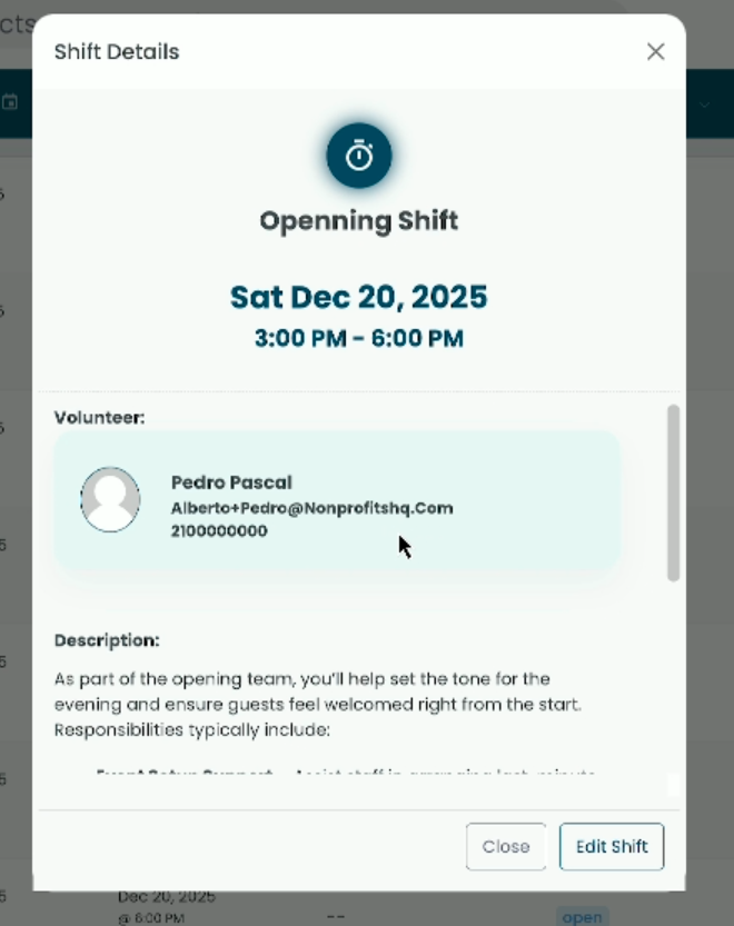When you click View Details, a popup will appear showing all the information about the selected shift and the volunteer currently assigned.