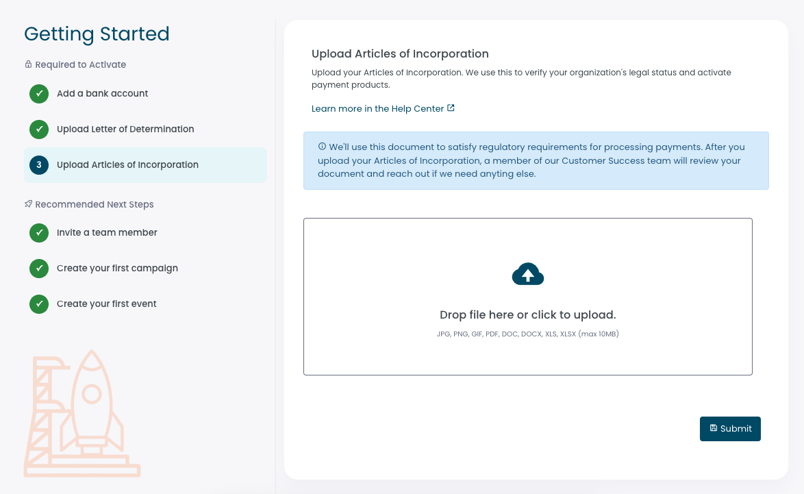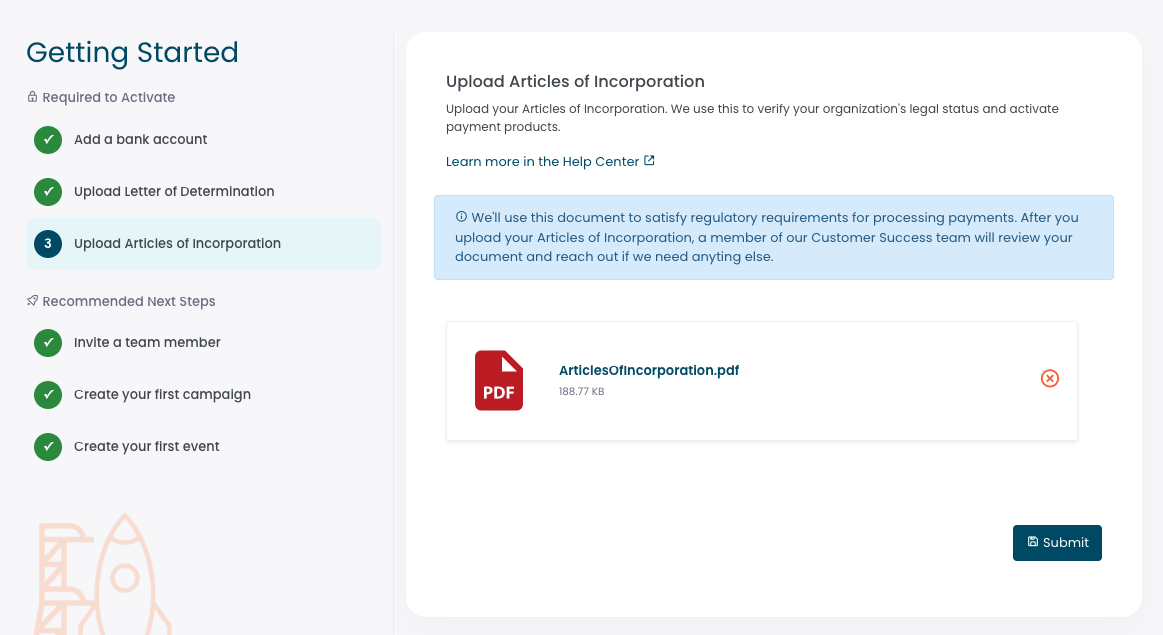 Once your Articles of Incorporation document is uploaded, our team will review the document and use it during your organization verification process.